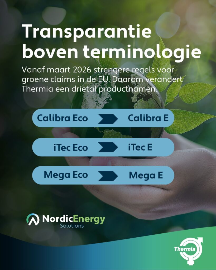 Onder de nieuwe regels zijn algemene termen als ‘eco’, ‘groen’ of ‘milieuvriendelijk’ alleen toegestaan wanneer zij duidelijk en objectief kunnen worden onderbouwd. Om elke vorm van mogelijke misleiding te voorkomen, heeft Thermia besloten een aantal productnamen aan te passen: